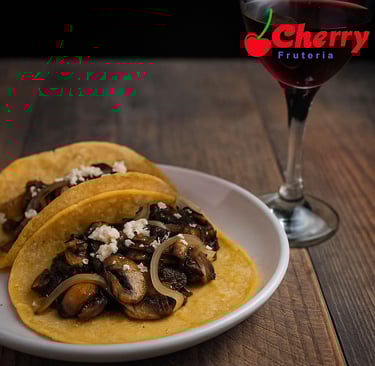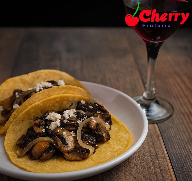 - Vino tinto natural con tacos de hongos al ajillo